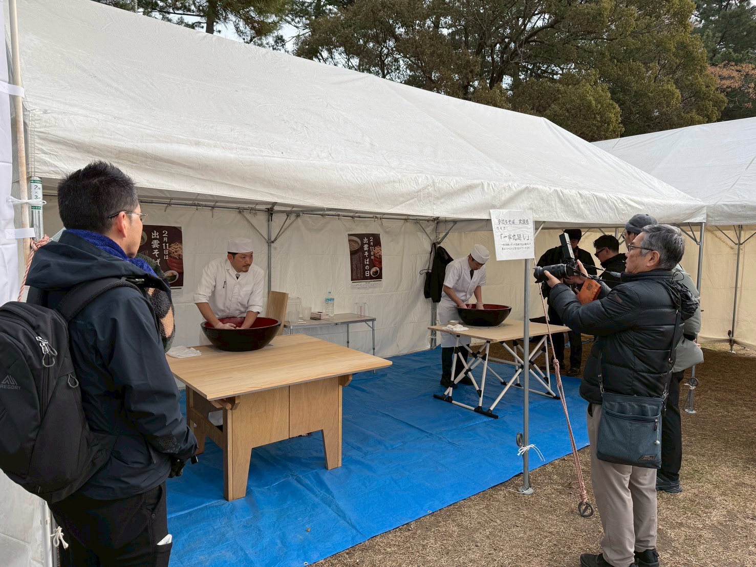 当日は早朝より、勢溜りの野外ブースにて田中屋さん、風月庵さんによるそばの手打ちを行い、そのそばを釜揚げそばとして調え、出雲大社へ奉納し、祈願祭を行いました。